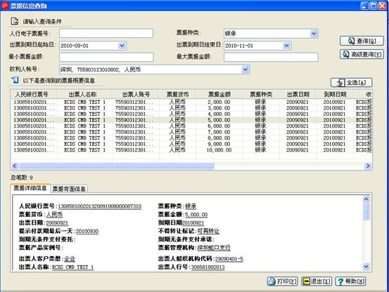 查询人可通过人行电子票据号、票据种类、出票到期起始日、出票到期结束日、最小票据金额、最大票据金额、权利人账号等条件对票据进行查询,点击“票据详细信息”和“票据背面信息”还可查到票据的明细
