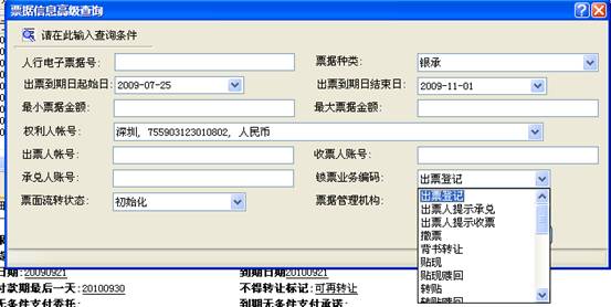 点击还可通过更进一步的参数设定如:出票人账号、收票人账号、承兑人账号、锁票业务编码、票面流转状态、票据托管机构等对票据进行精确查找。