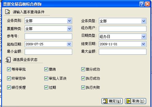 还可通过更进一步的参数设定如:业务类别、业务类型、票据种类、经办用户、参考号、日期类型、起始日期、结束日期、最小金额、最大金额、业务状态等对票据进行精确查找。