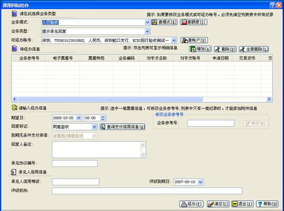承兑人根据需要可在电子商业汇票上选择填写“回复人备注”项、“承兑协议编号”项和“承兑人评级信息”项。承兑人评级信息包括:信用等级、评级机构和评级到期日。