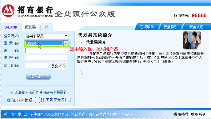 证书用户绑定了登录用户后,选择证书登录会自动带出绑定的用户登录名,用户可以通过下拉列表选择。 如果用户未绑定登录用户或者进行初次绑定,此时下拉登录名下拉列表为空,请选中下拉框,敲键盘进行用户名录入,如图: